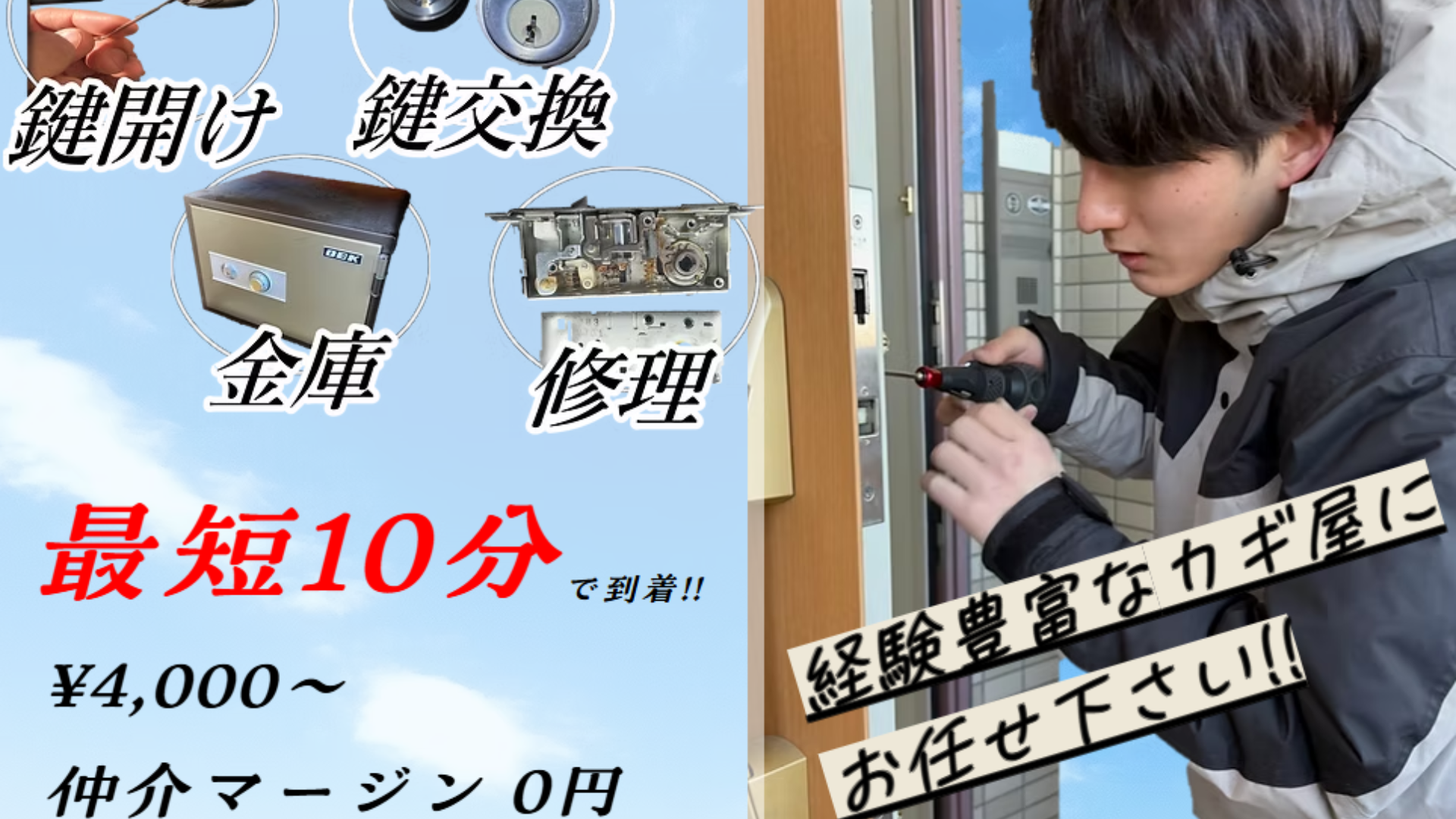 カギの110番・赤羽/川口サービスセンター緊急出張・24時間は、地域密着型で「鍵開け」「鍵交換」「鍵修理」「紛失キー作成」など、幅広い鍵トラブルに即対応する鍵屋です。24時間365日、赤羽エリアを中心に最短到着を目指し、急なトラブルにも安心のスピード対応を実現しています。手数料なしの明朗会計で料金を抑えた適正価格、15年以上の実績による高い技術力、さらに現場のカギ師と直接つながる安心感が強み。各種部品も豊富に取り揃えているため、その場でほとんどの作業が可能です。無理な提案は一切せず、お客様にとって最適な解決策をご提案しますので、安心してお任せください。