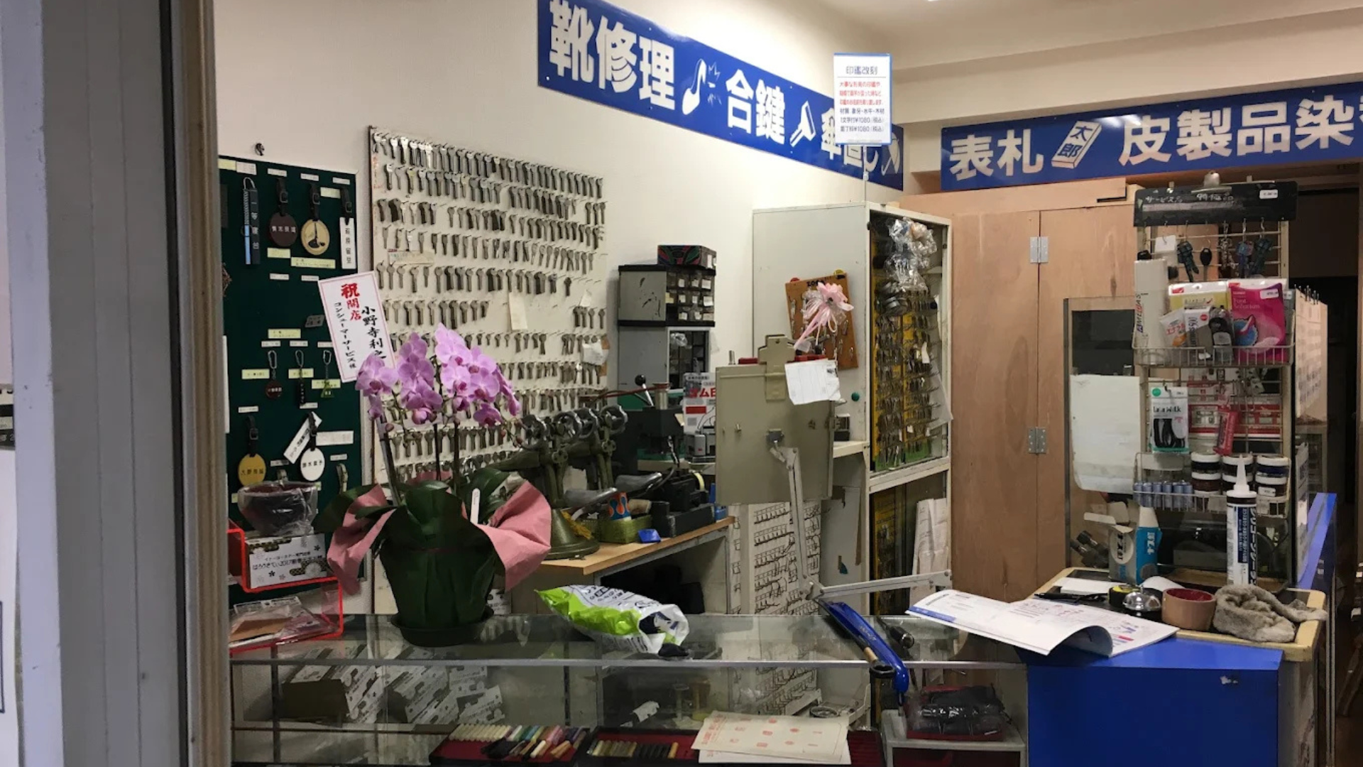 合鍵作成は、ディンプルキーや自転車キーなど多様な鍵に対応。ご自宅のドアから日常のちょっとした困り事を解決します。また、家庭用包丁の研ぎや柄の交換、革製品の染め直しや鞄の補修、スニーカーの修理まで、暮らしに密着したあらゆるメンテナンスを承ります。何でも気軽にご相談いただける、町の頼れる存在でありたい。それが私の願いです。
